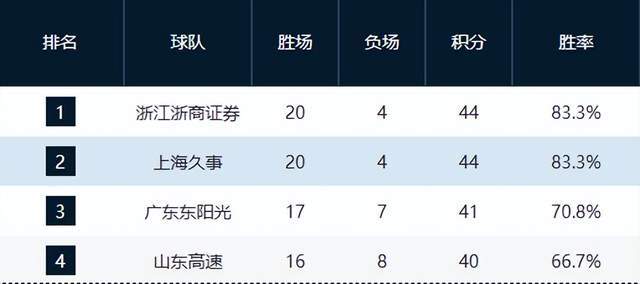 广厦20胜4负稳居榜首,主场33分血洗同曦,统治力依旧;上海同为20胜4负,因净胜分劣势屈居第二,双雄领跑,身后追兵已无望。